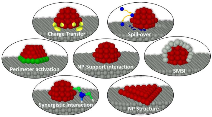 典型的金属-载体(MIS)现象包括电荷转移、溢出效应、周边激活、纳米粒子-载体相互作用、表面金属-载体相互作用(SMSI)、纳米粒子结构效应以及协同作用。这些元素常常相互作用,并在不同的催化反应中发挥不同的作用。