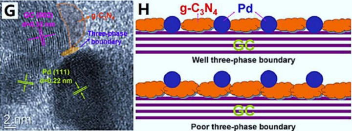 过渡金属氧化物、磷化物、碳化物、氮化物和碳氮化物是泛用作铂和钯催化剂的助催化剂。制备的一种新型的石墨碳氮化物/石墨碳/钯纳米复合物(Pd@g-C3N4/GC)作为高效电催化剂,能确保从GC、g-C3N4和Pd组分中形成良好的三相固体界面(图4)。