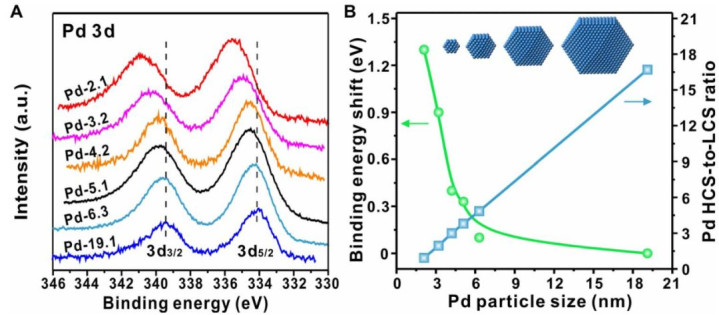 协同电子效应是指不同组分之间相互作用,使复合材料的电子结构(如电子态密度、电负性和结合能)显著区别于单一材料的现象。根据尺寸依赖性电子效应对纳米颗粒催化性能的影响:随着粒径减小,晶体中低配位位点的比例增加,导致纳米颗粒的电子结合能发生变化(图2)。