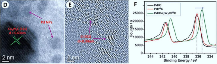 通过界面相互作用(界面协同电子效应)可调控Pd的电子结构:在石墨碳载体上,Pd与Co3W3C的复合使相同尺寸的Pd结合能降低1 eV,优于Pd/GC和Pd/C体系(图3)。这种电子转移效应在GC支撑的Pd与Co3W3C组分间协同发生,即协同电子效应。